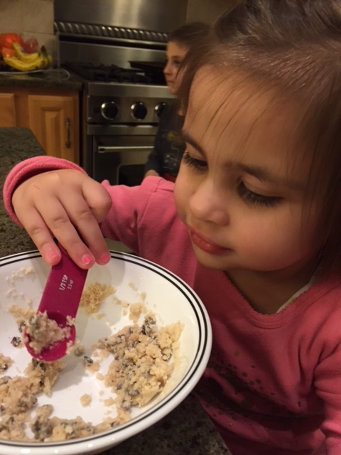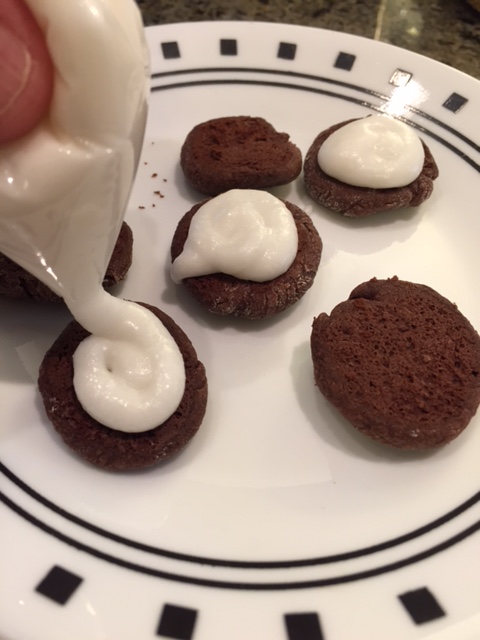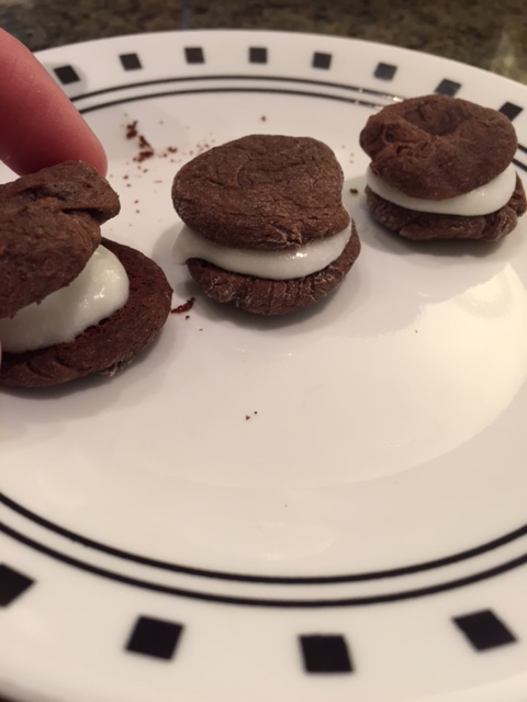 We save the challenge for today. Chocolate whoopee pies. It seemed pretty simple, until you have to mess with the dough. I could not take pictures because I had chocolate dough all over my hands. Sticky doesn’t even begin to cover it. I used flour, it was still impossible to get a perfect round ball on that baking sheet. No 8 year old could ever do this alone.