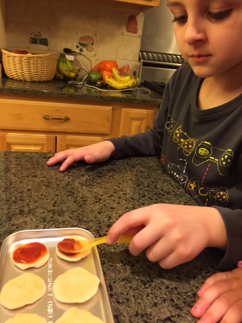 So we got right to baking. First up, mini cheese pizza bites. The box has little envelope of powder for everything, dough, marinara sauce, cheese sauce, even an egg glaze?! Just add water and stir, we all fought over who got to stir first.