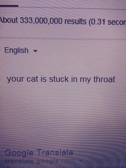 And can I just say…. I had NO idea I could actually find an image to go along with having a cat stuck in your throat, or a cat about to be stuck in your throat. But there are many. So this is a phrase that may well come in handy, if you’re into that sort of thing.